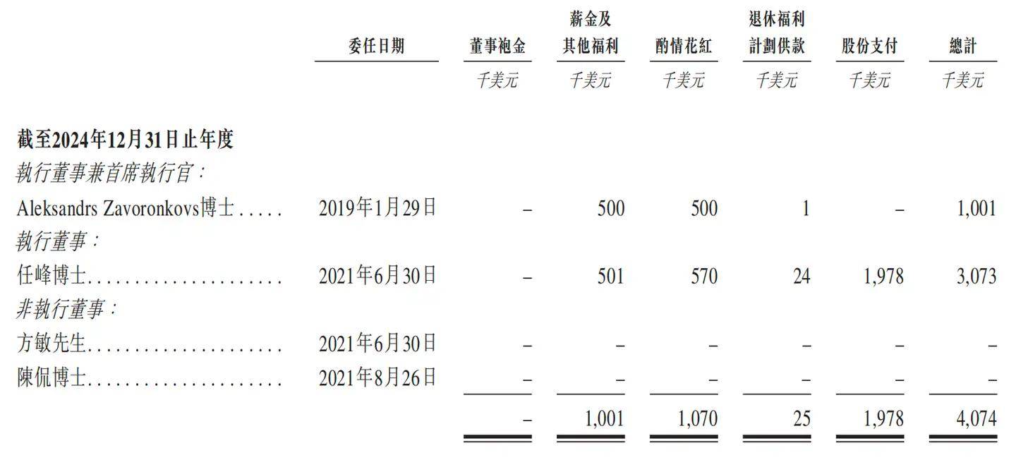 据招股书,目前,英矽智能取排名前20的全球制药公司(按2024年报密告卖额计)中的13家连结合做关系,公司正将Pharma。AI的使用范畴扩展至少个行业,如先辈材料、农业、养分产物及兽医药物等范畴。 2024年,英矽智能的董事薪酬如下,扎科夫博士为100。1万美元(约合人平易近币703。55万元),任峰博士为307。3万美元(约合人平易近币2159。9万元)! 扎科夫于2008年取得俄罗斯莫斯科国立大学物理及数学博士学位,曾持久担任英国生物老年学研究基金会的参谋、莫斯科物理手艺学院(国立研究型学院)国际兼职传授。截至目前,扎科夫已颁发超300篇研究论文以及3本著做。 截至2025年12月10日,英矽智能的候选药物尚未实现贸易化,正在业绩记实期内,管线药物开辟营业发生的收入次要为该公司对外授权三款候选药物所发生的收入,此中,ISM3091项目标营收占比最高,2022年至2025年上半年的合计收入为9102万美元(约合人平易近币6。38亿元)。 扎科夫是人,本年46岁,自英矽智能成立起便担任公司的董事会、董事、首席施行官兼首席营业官,2023年6月获调任为施行董事。 英矽智能拟募资20。26亿港元(约合人平易近币18。27亿元),用于管线候选药物、AI模子、晚期药物的进一步研发,开辟和扩展从动化尝试室和一般公司用处。