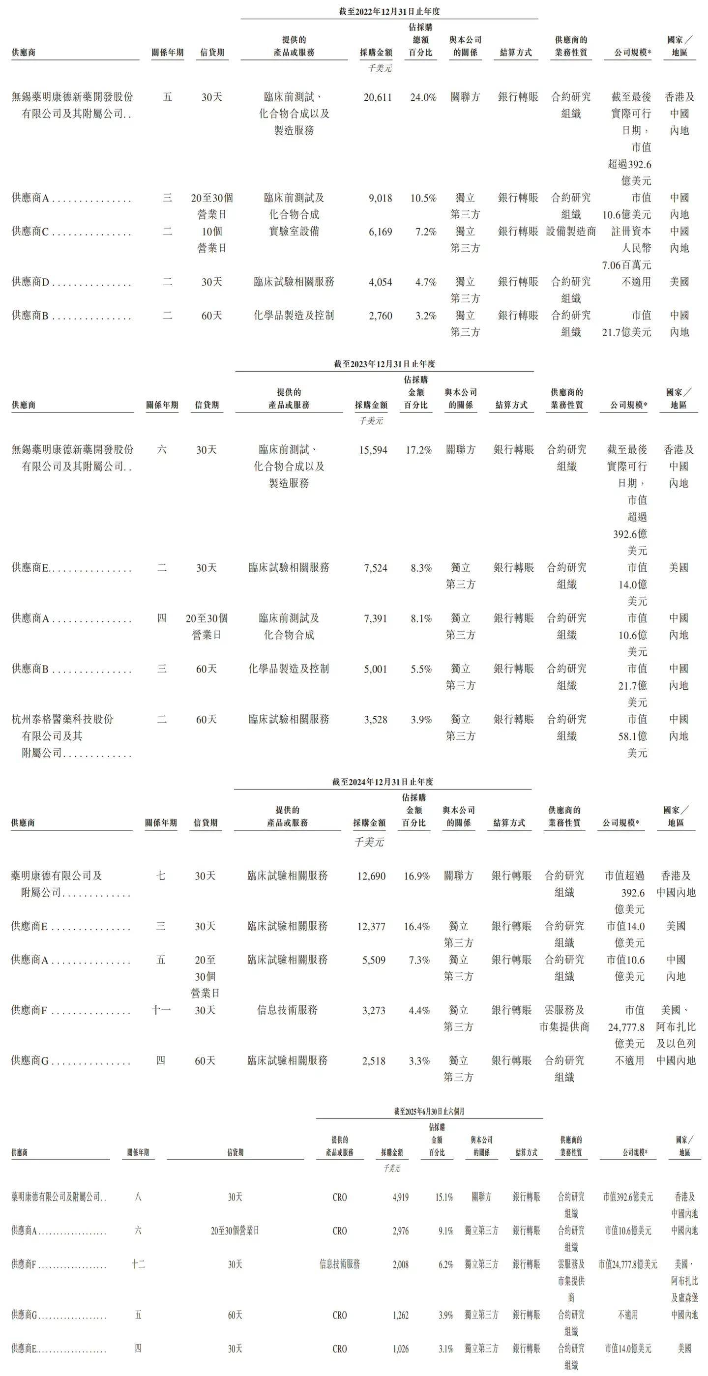 2022年、2023年、2024年、2025年上半年,英矽智能的毛利率别离为63。4%、75。4%、90。4%、83。8%,毛利率稳步增加次要是遭到管线药物收入以及对外授权买卖里程碑付款的影响。 2022年、2023年、2024年、2025年上半年,英矽智能前五大供应商的采购额别离为4260万美元(约合人平易近币2。99亿元)、3900万美元(约合人平易近币2。74亿元)、3640万美元(约合人平易近币2。56亿元)、1220万美元(约合人平易近币8574。77万元),别离占当期总采购额的49。5%、43。0%、48。3%、37。4%。
