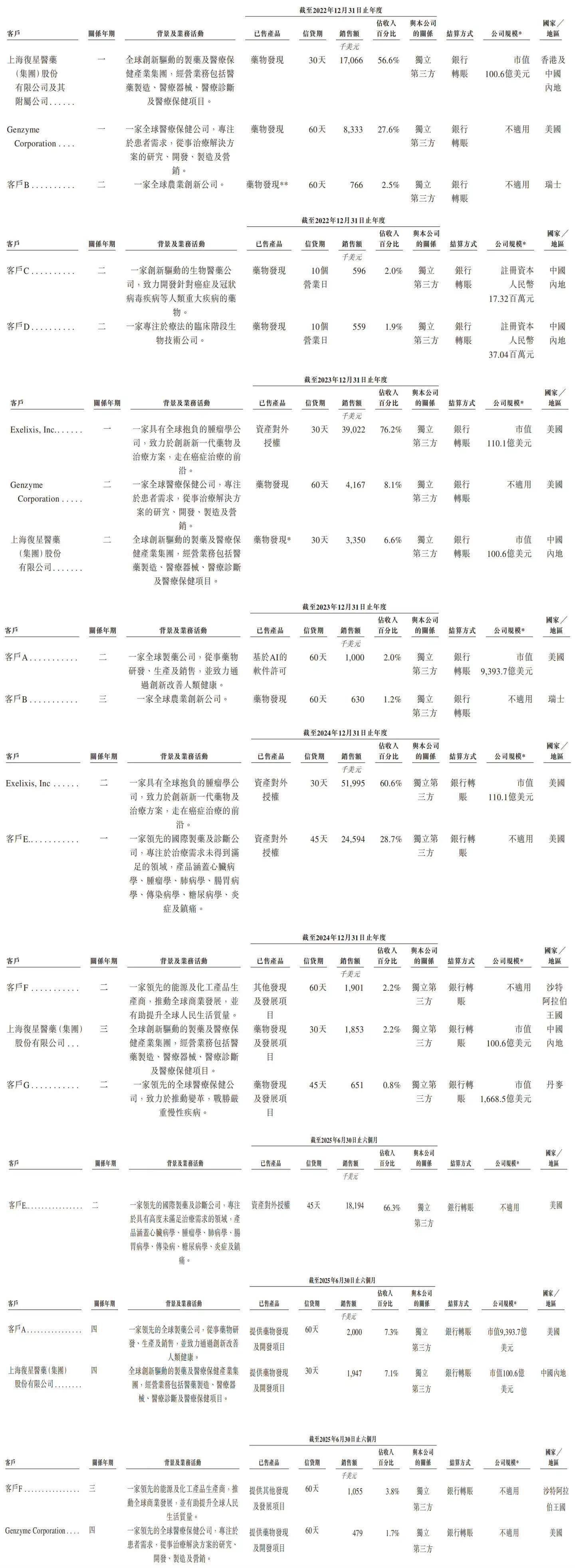 英矽智能成立于2014年,官网显示该公司的总部位于和。英矽智能开辟了全球首款利用端到端生成式AI发觉并开辟的药物ISM001-055,这一药品已完成IIa期临床试验(癌症II期、中期)。该公司具有10项进入临床试验的管线药品,正在数量上全面超越其他AI制药公司,其次要产物从发觉阶段进入临床阶段的周期仅为12个月,远低于行业平均的4。5年,仅不到行业平均程度的1/4。 2022年、2023年、2024年、2025年上半年,英矽智能前五大客户发生的收入别离为2730万美元(约合人平易近币1。92亿元)、4820万美元(约合人平易近币3。39亿元)、8100万美元(约合人平易近币5。69亿元)、2370万美元(约合人平易近币1。67亿元),占当期总收入的90。6%、94。1%、94。4%、86。2%,最大客户发生的收入占当期总收入的56。5%、76。2%、60。6%、66。3%。